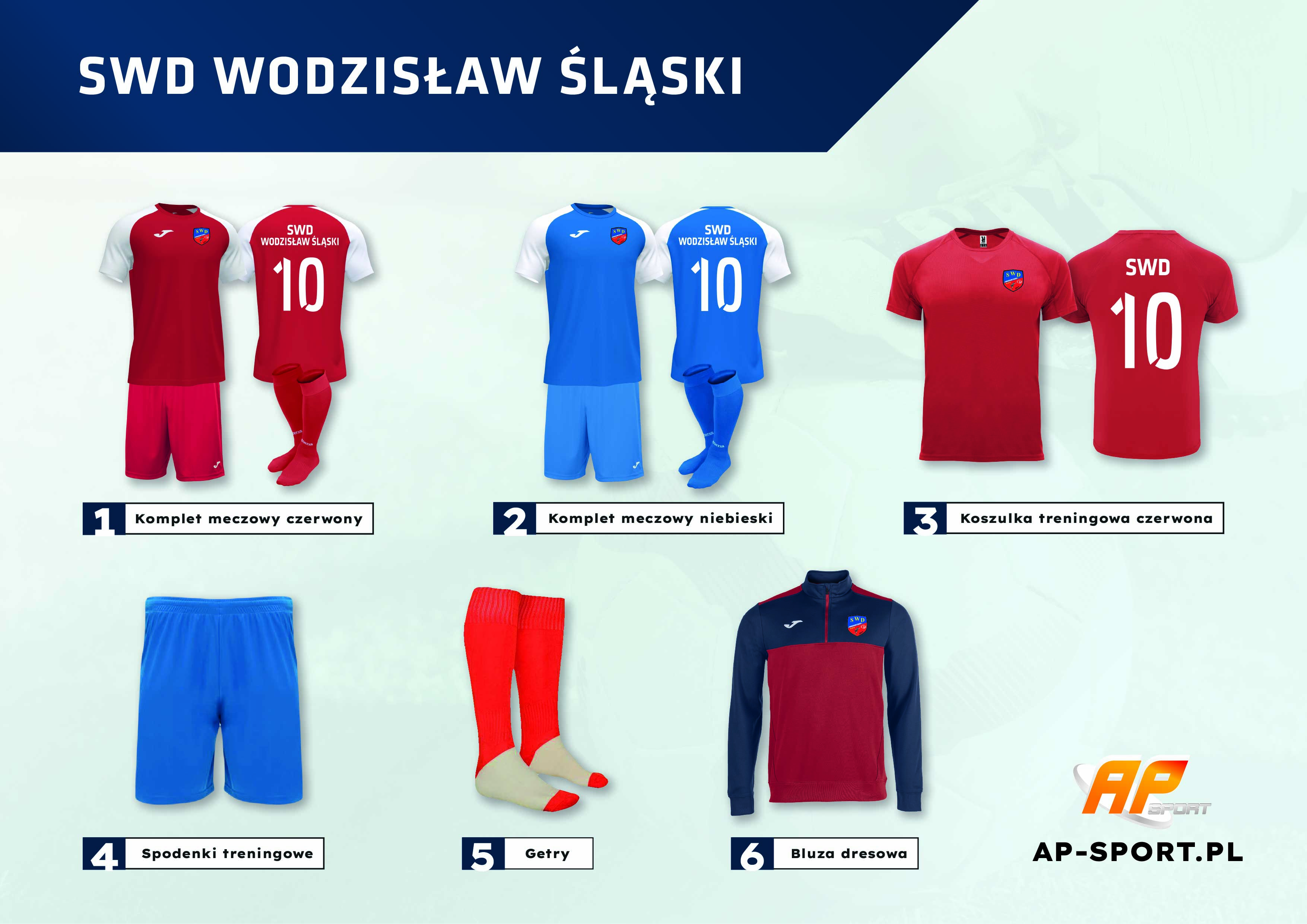 W SWD Wodzisław Śląski stawiamy również na profesjonalny i najwyższej jakości sprzęt sportowy firmy JOMA. Poniżej prezentujemy szczegółowy cennik. Osoby zainteresowane zakupem proszone są o kontakt drogą telefoniczną, na numer: +48 798 268 099.